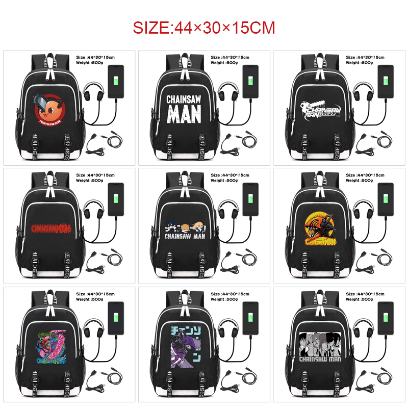 电锯人动漫周边白拉链数据线双肩背包 学生usb充电接口帆布书包 电锯人-4